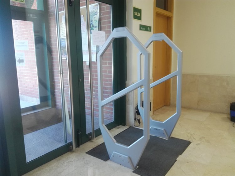 Este sistema antihurto se instaló en una de las dos puertas del acceso a la biblioteca. En la otra puerta hay un sistema de otro fabricante siendo ambos totalmente compatibles.